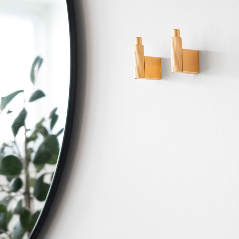 373121-11Arpa-serien kombinerer en elegant industriell design med en subtil rillet overflate av striper. Knagg Arpa i børstet messing har et tidløst design og passer inn i både moderne og tradisjonelle miljøer. Veggknaggen er ikke bare praktisk, men også en vakker innredningsdetalj - det perfekte valget for både funksjonell og estetisk oppheng.