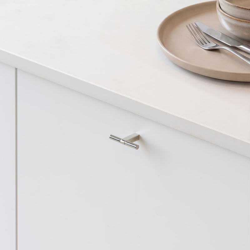 343563-11Knott T Petit kjennetegnes av sin nette og elegante form. Den sylinderformede grepsdelen hviler på en smal, lett avsmalnende fot som gir knotten et balansert og gjennomarbeidet uttrykk. Den T-formede silhuetten skaper et tydelig grep og tilfører en stilren detalj til møbelet – små detaljer som gjør en forskjell.